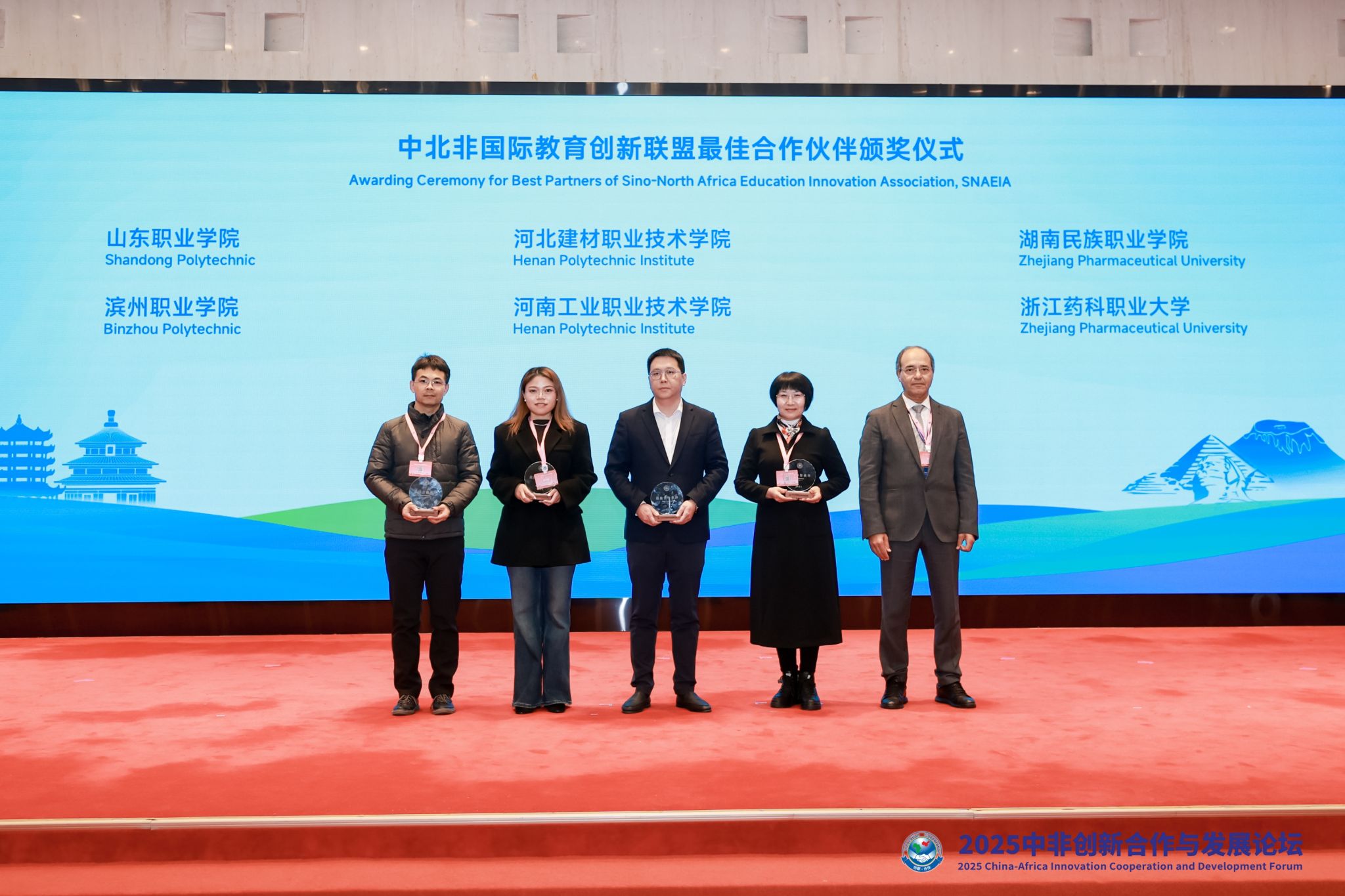 11月20-21日,由中非创新合作中心、中北非国际教育创新联盟联合主办的“2025中非教育合作创新发展论坛”在武汉成功举办。论坛聚焦“新时代中非职教合作创新与高质量发展论坛”“数智时代中非高等教育人才培养与科研合作高等教育分论坛”两大主题。滨州职业学院党委委员、滨州应用科技研究院院长胡洪涛应邀出席并主持“2025一带一路暨金砖国家技能发展与技术创新大赛-北非国际赛”启动仪式和大赛中外方组委会及专家证书颁发仪式,国际学院相关人员陪同参会。