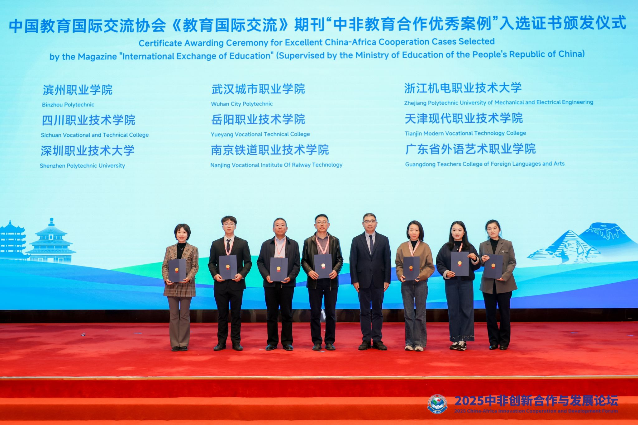 论坛期间,我校在中非职业教育合作领域的实践成果获得多方认可,成功入选中国教育国际交流协会《教育国际交流》期刊“中非教育合作优秀案例”,并获颁证书;同时,学校被评为“中北非国际教育创新联盟最佳合作伙伴”,荣获联盟授予的奖杯,充分展现了我校在职业教育国际交流与合作中的扎实成效与示范作用。
