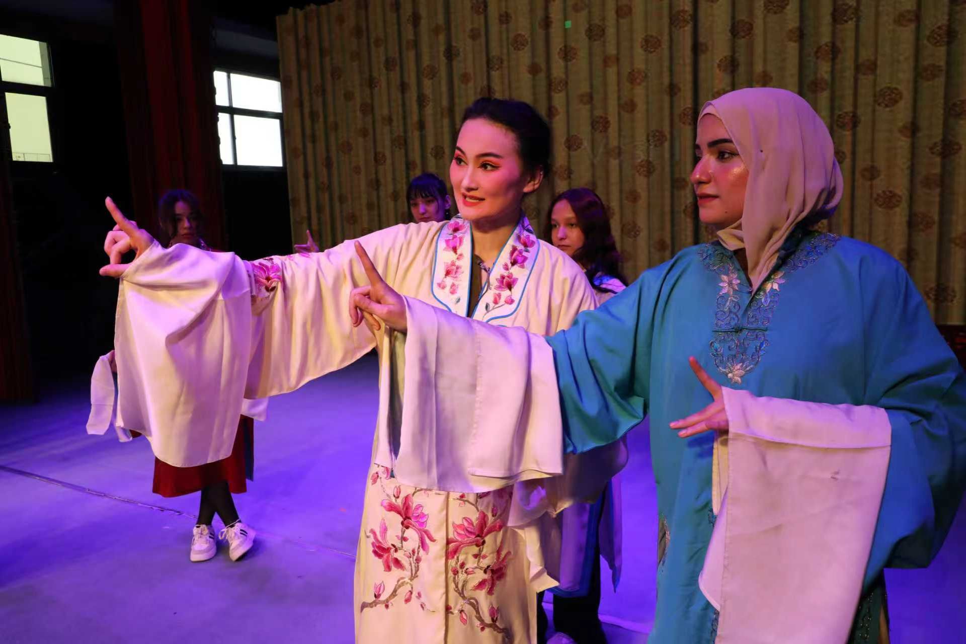 3月23日下午,我院10名留学生在3名教师带领下走进博兴县剧团,共同参加第二届中国稀有剧种优秀剧目展演闭幕式,沉浸式体验吕剧魅力。在戏服体验区,留学生们换上戏服、学做身段,来自也门的马里克一边整理着水袖,一边笑着说:“感觉自己穿越到了中国古代的舞台上!”闭幕式上,滨州本土的大型东路梆子新编历史剧《荐官记》作为优秀剧目登台亮相。“虽然我听不懂他们在唱什么,但我能感受到那种情感,很真挚、很有力量。”来自阿富汗的吴远这样说道。
