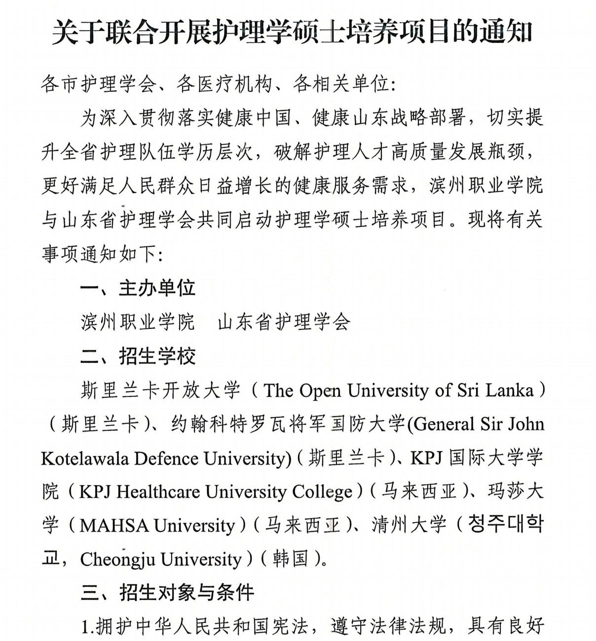 为深入贯彻落实健康中国、健康山东战略部署,切实提升全省护理队伍学历层次,破解护理人才高质量发展瓶颈,更好满足人民群众日益增长的健康服务需求,滨州职业学院与山东省护理学会共同启动护理学硕士培养项目。